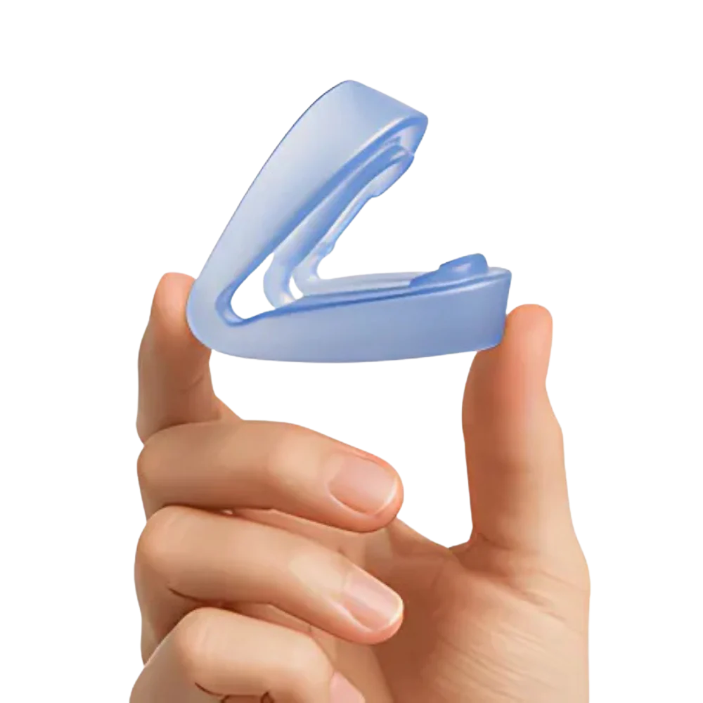 Fabricado en silicona hipoalergénica azul celeste, CalmBlue™ se adapta perfectamente a los dientes, posicionando suavemente la mandíbula para mejorar la respiración y evitar el rechinido. Es discreto, fácil de limpiar, reutilizable y tan cómodo que ni sentirá que lo lleva puesto.